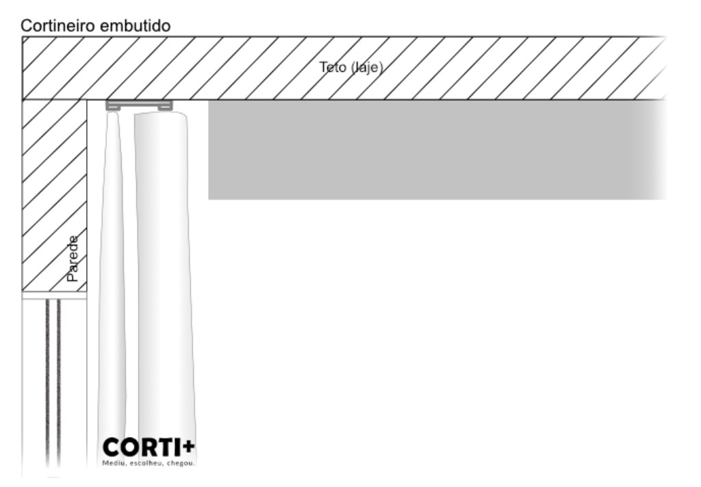 💡 Dica Cortimais: o cortineiro embutido é ideal para quem deseja aquele efeito de cortina “saindo do teto”.