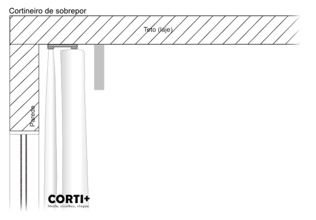 O cortineiro sobreposto fica saliente em relação ao teto, cobrindo o trilho na parte superior da cortina.